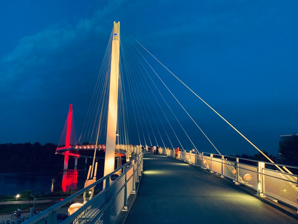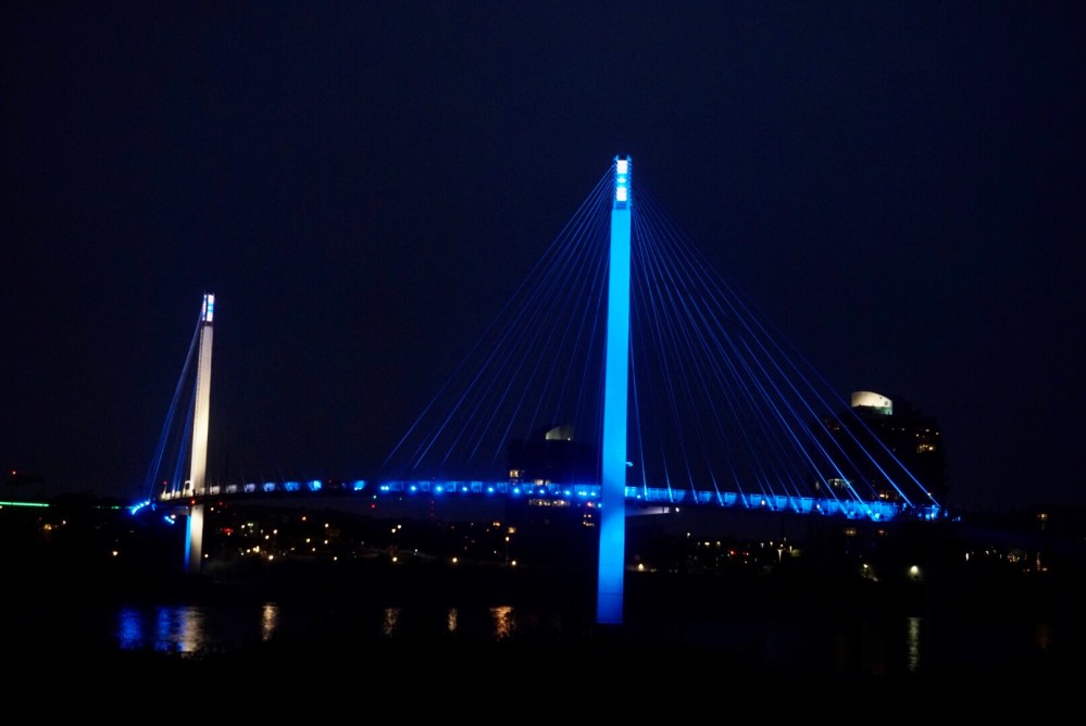 Bob Kerrey Pedestrian Bridge is 910 meter walk-bridge across Missouri River which connects Omaha, Nebraska to Council Bluffs, Iowa. Bridge is very popular among tourists and local residents. We have been there multiple times, my most recent visit was 2 weeks back.
