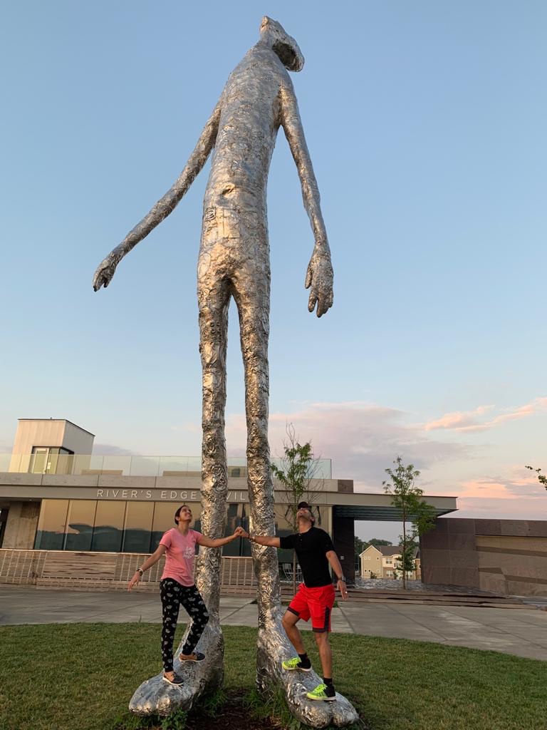 Iowa Side :- There is a big plaza which hosts free live music on each Fridays of the summer (currently impacted due to COVID). It is surrounded by large amphitheater-fashioned ground seating. At the rear end of the plaza, there is high ground pavement with sitting arrangements to watch beautiful sun-set and Omaha’s Skyline. If you have watched “The Haunting of Hill House” or read the book, you must be familiar with infamous “Bent Neck Lady”. You can find Bent Neck Man standing here 🙂